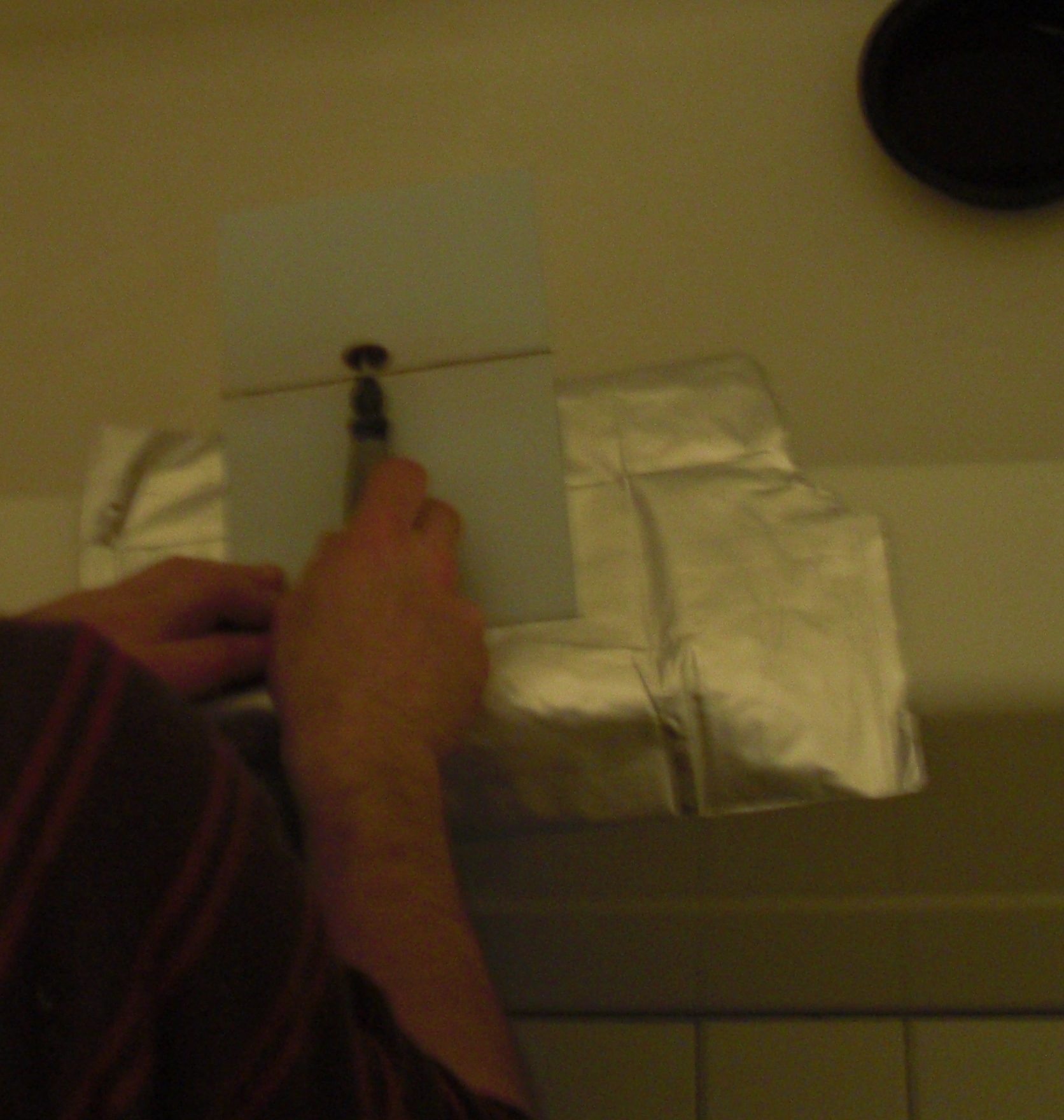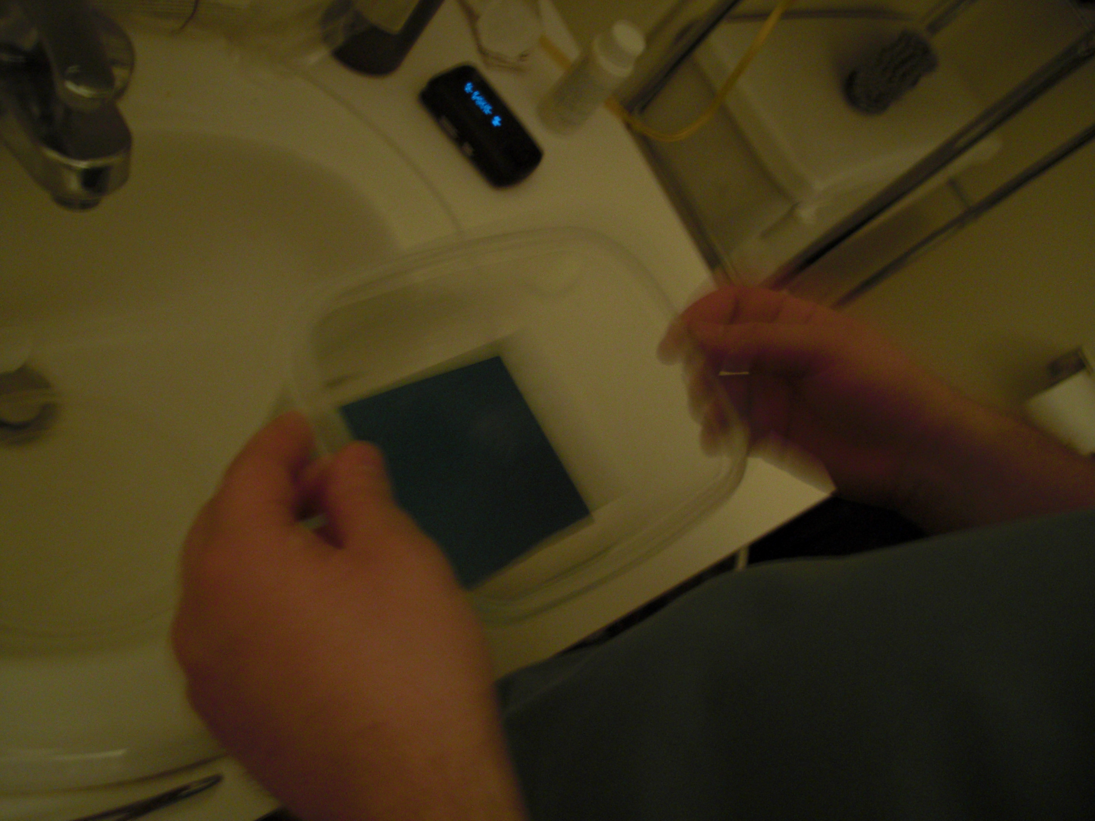 And here is me clamping the board in its little pocket. I used hemostats, they are quite handy for soldering. In this picture the board has its protective white layer removed. The room is lit by a 25W incandecent bulb.