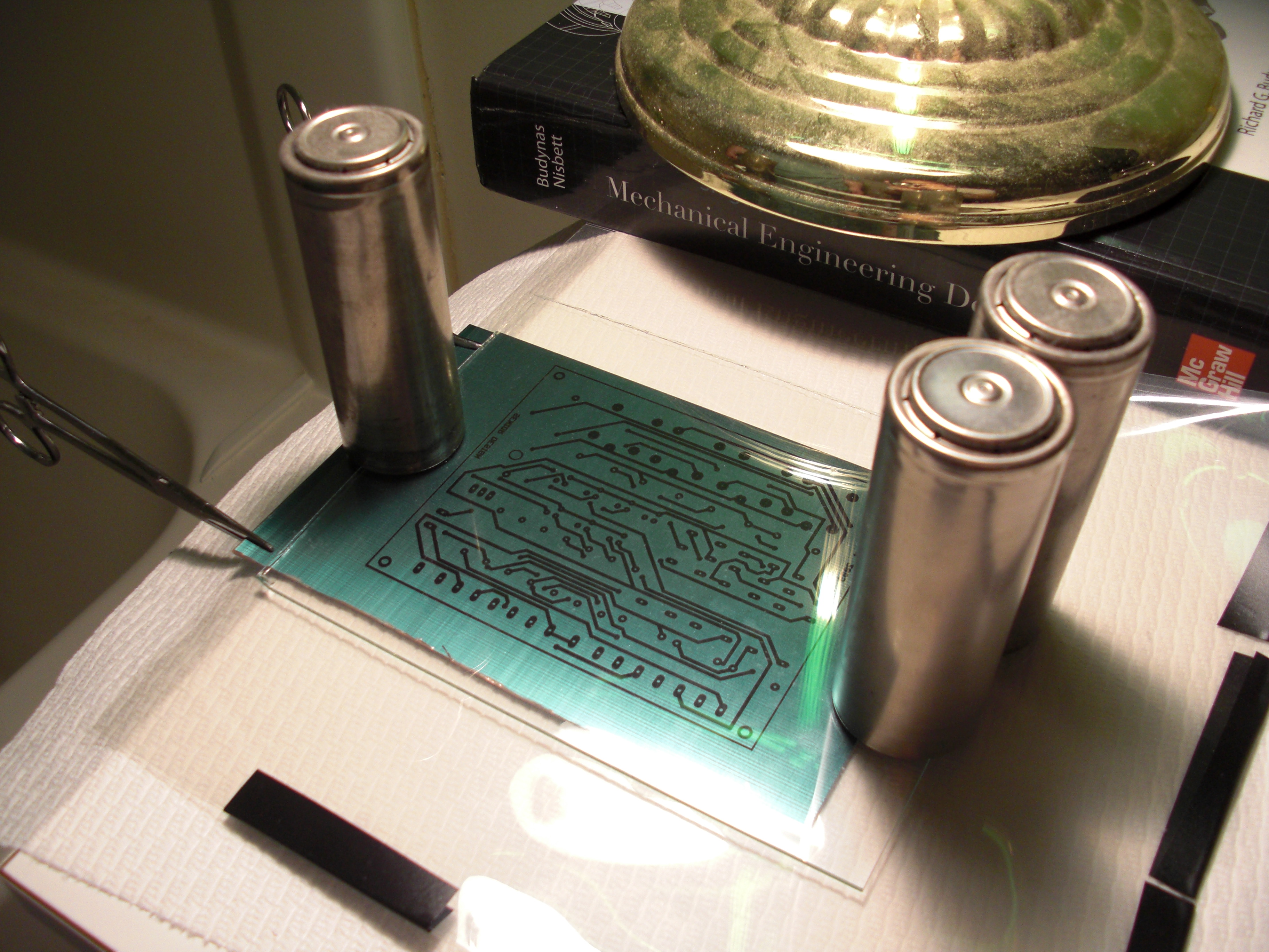 After everything is clamped, you put your board under a piece of glass to hold it down. Unfortunately since i made a pocket, and the glass was only 1/8 inch glass I had to use some weights. Those are what is inside a 6V lamp battery. To expose there are instructions which I have included at the bottom of the page, I like to use a 100W bulb at 12 Inches (12 inches to the bottom of the bulb, not the center). The instructions say 10-12 minutes, but I found 15 for inkjet, 13 for laser, works much better.