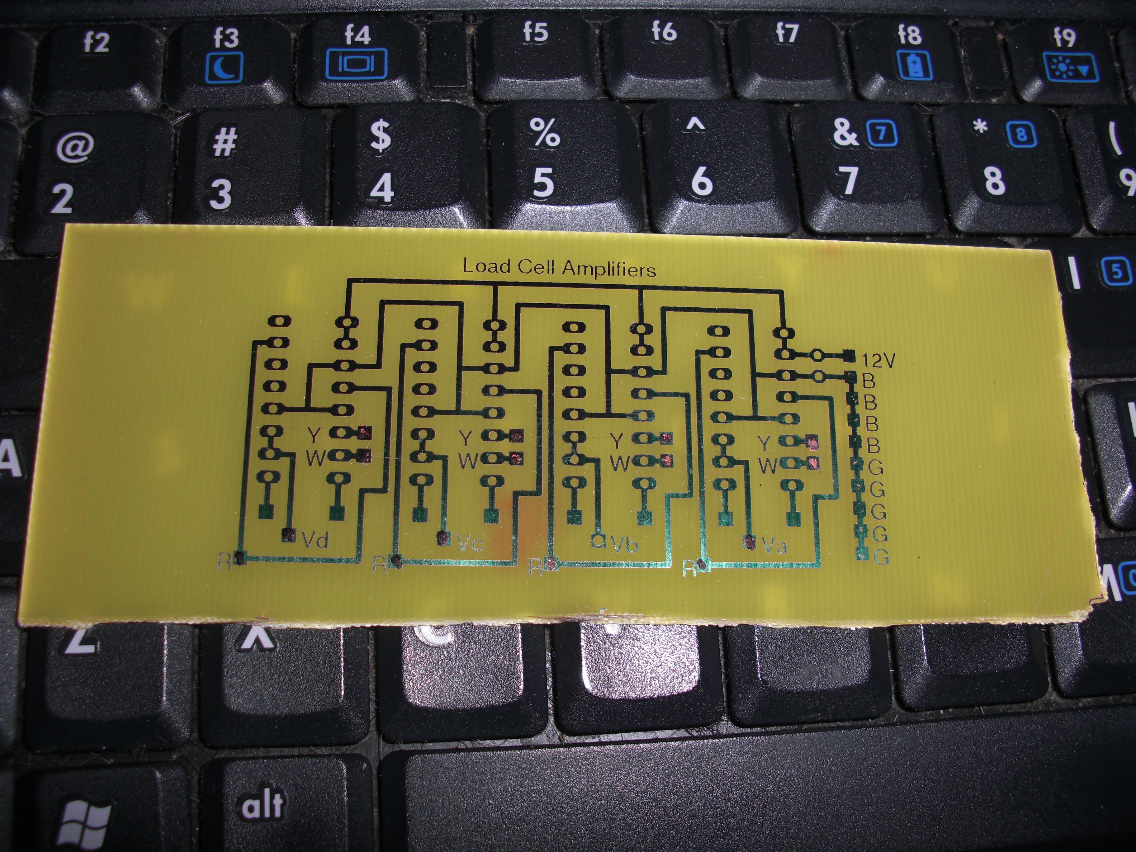 This person wanted the blue removed after it was etched. I personally prefer to leave it. It melts when soldered, and if you are careful not to scratch it you can use it to protect the traces from corrosion. Here is a board I made for myself. You can see a little copper, because I filled in a few of the pads with orange sharpie before etching I wanted to use tiny leads. This board is for making a budget force gauge. I will write an article about it later.